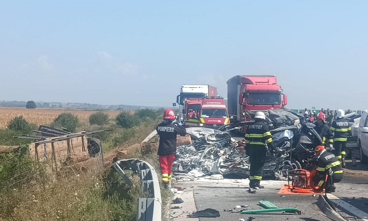 Un TIR încărcat cu lemne, care circula pe A1 Deva-Nădlac dinspre Timişoara spre Lugoj, a intrat pe contrasens, după ce i-a explodat un pneu. În urma incidentului, camionul a pătruns pe sensul opus de mers şi a intrat în coliziune cu un autovehicul condus de un bărbat de 60 de ani, după care s-a izbit de alte două autovehicule.