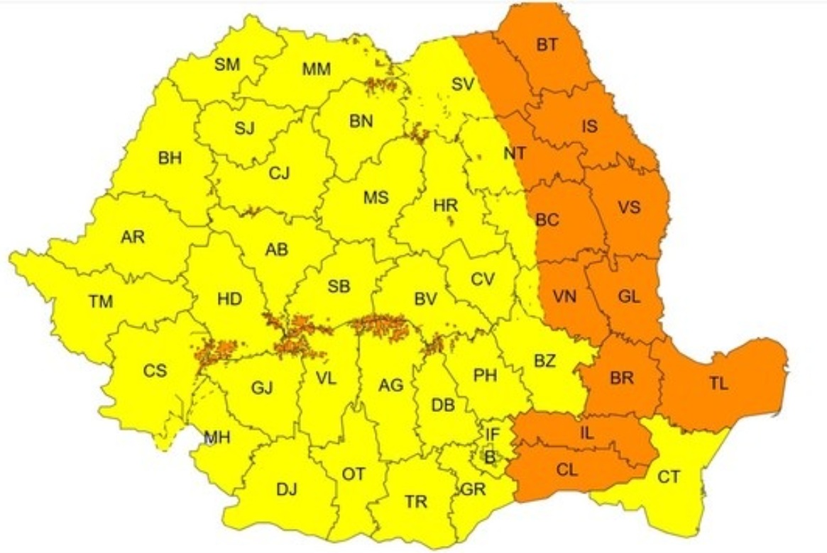 În același timp, mai multe județe din estul țării se află sub cod portocaliu între orele 12:00 și 18:00. Sunt vizate județele Botoșani, Iași, Vaslui și Galați, precum și zonele joase din Suceava, Neamț, Bacău și Vrancea, unde rafalele pot ajunge la 70–90 km/h.