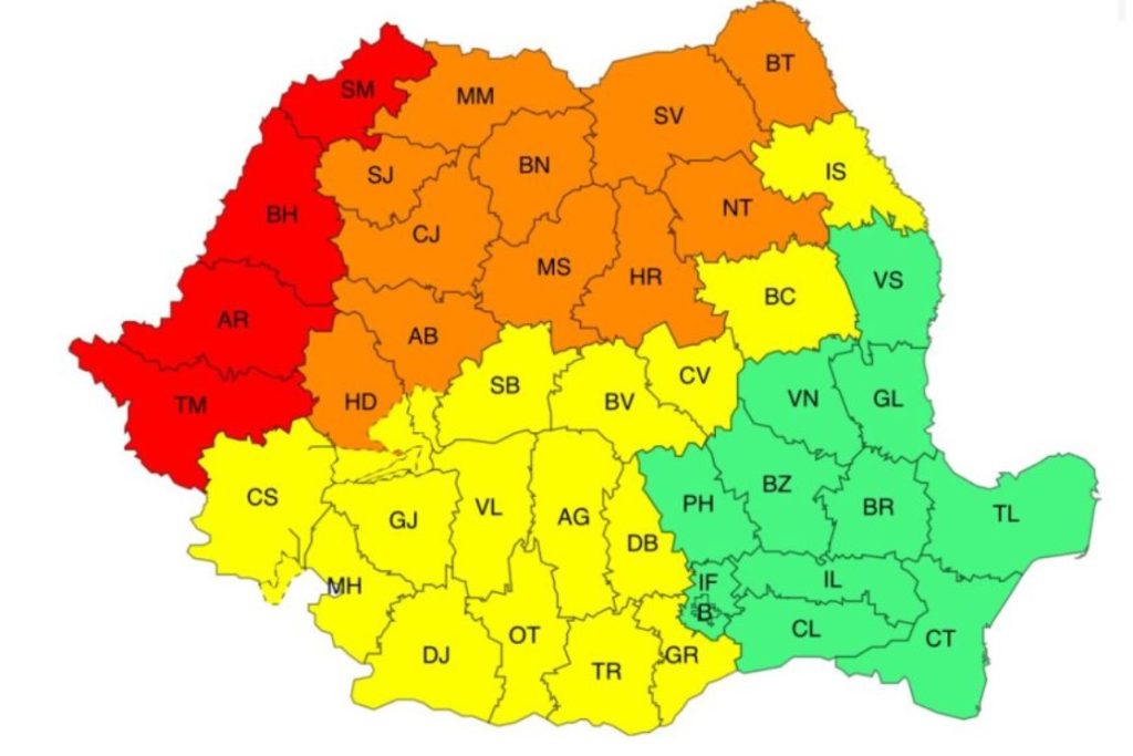 Judeţele Timiş, Arad, Bihor şi Satu Mare sunt vizate de o avertizare Cod roşu de vijelii puternice, valabilă luni în intervalul orar 15:00 – 20:00.