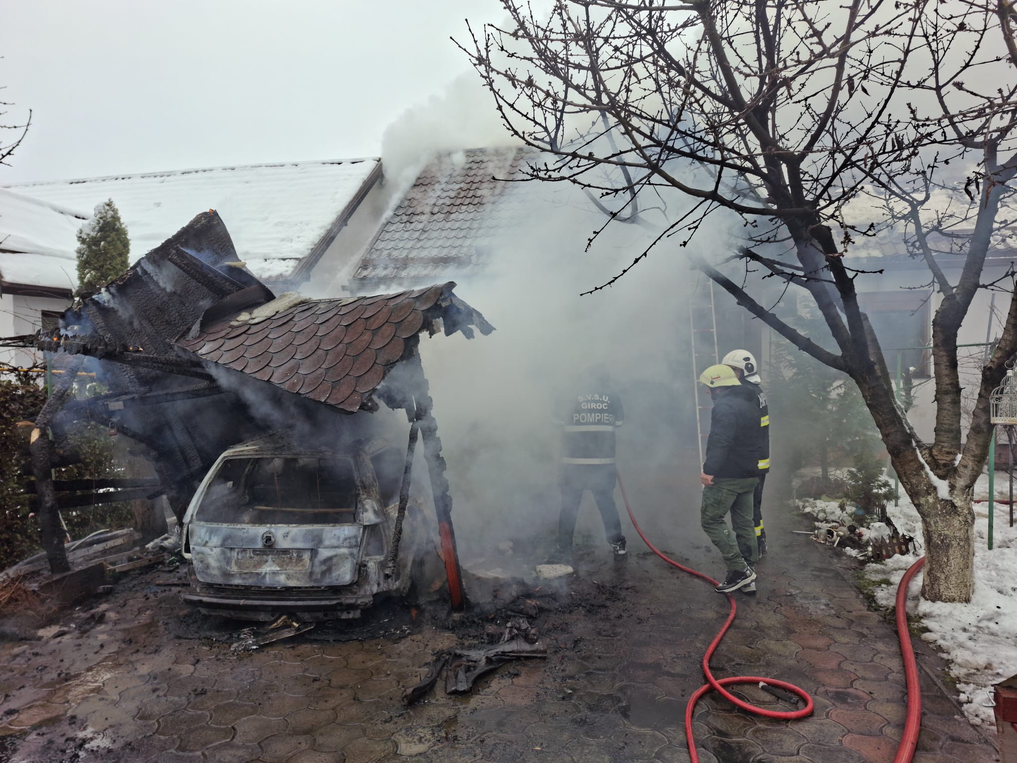În jurul orei 13:15, echipajele de intervenție au fost alertate pentru stingerea unui incendiu izbucnit la un autoturism parcat în curtea unei locuințe situate pe strada Dunărea, în comuna Giroc.