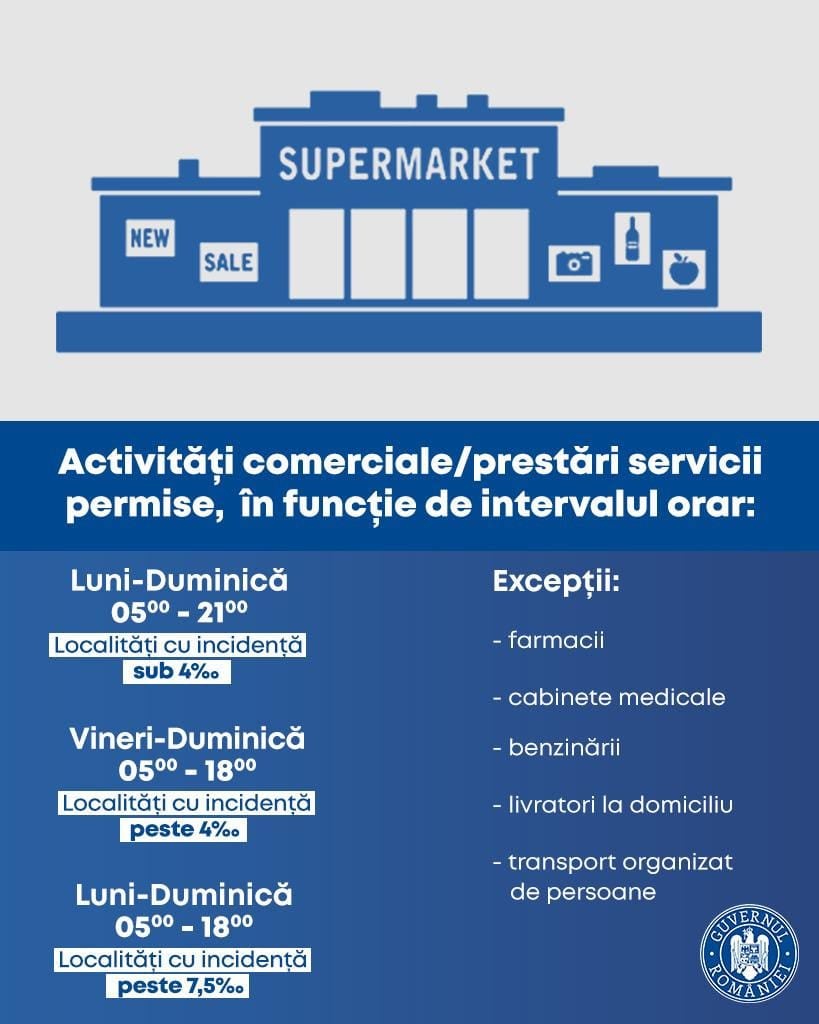 Prin urmare, programul magazinelor, teraselor și cel al circulației persoanelor nu se modifică automat la scăderea incidenței, ci după trecrea celor 14 zile, dacă la reevaluarea situației se constată în CJSU o modificare a ratei de infectare.
