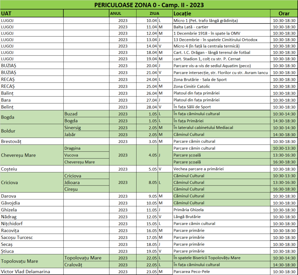 periculoase din menajer în zona 0 Ghizela a judeţului Timiş. Sunt incluse localitățile Lugoj, Buziaș,