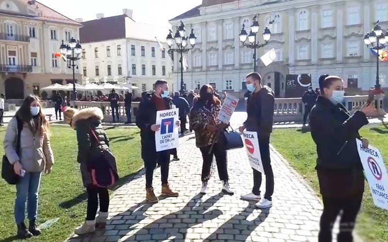 Angajatii din industria ospitalitatii din Timisoara au protestat marti, la ora 12.00, in Piata Unirii in fata unitatilor in care lucreaza, in centrul istoric...